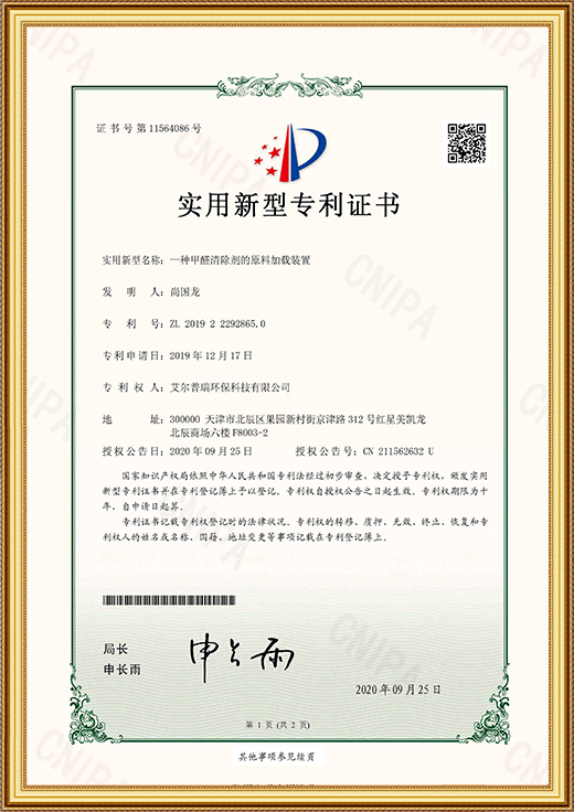 實(shí)用新型專利證書(一種甲醛清除劑的原料加載