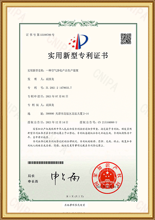 實(shí)用新型專利證書(一種空氣凈化產(chǎn)品生產(chǎn)裝置